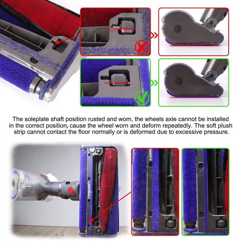 - High Matching: Cordless vacuum soft roller cleaner head rear soleplate replacement part, compatible with Dyson V6 V7 V8 V10 V11 soft roller cleaner head, with bottom soleplate wheels and soft plush strips. Except for all slim series and V6 small size wheels cleaner head vacuum cleaner