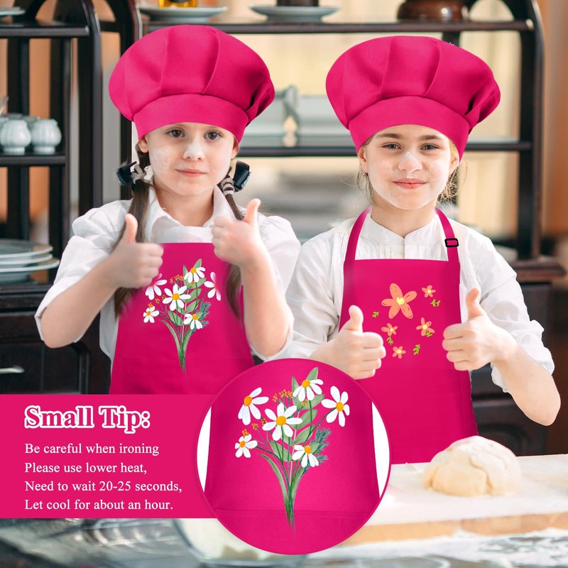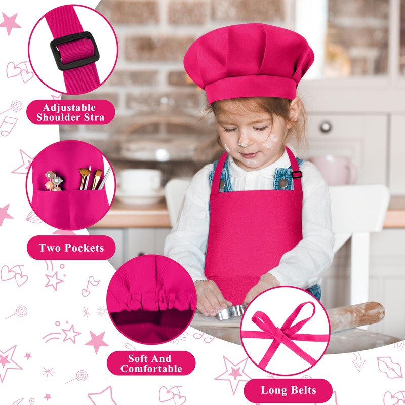 • MATCHING DESIGN Each kids art apron in kids apron set features two pockets and the length of the apron straps can be adjusted according to your child's size and shape. The chef's hat is comfortable to wear and has an adjustable elastic band