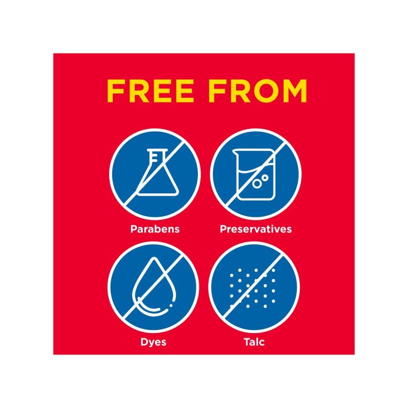 - Free from dyes, preservatives, parabens and talc
