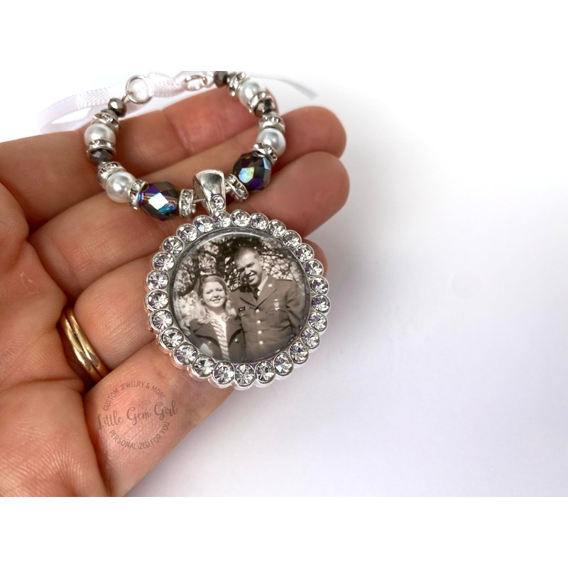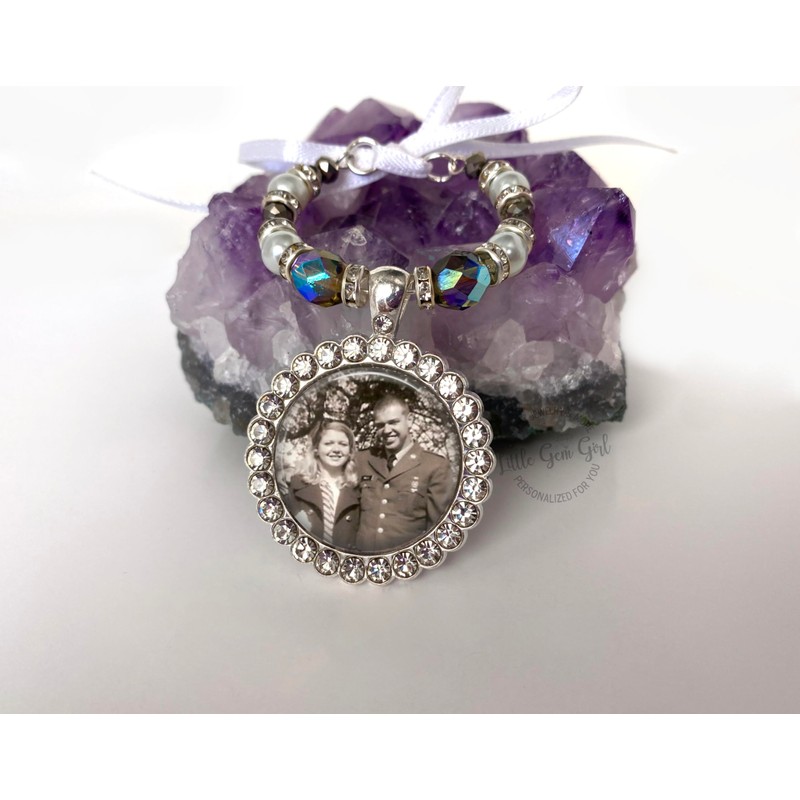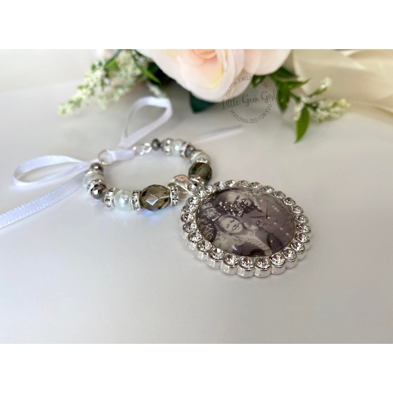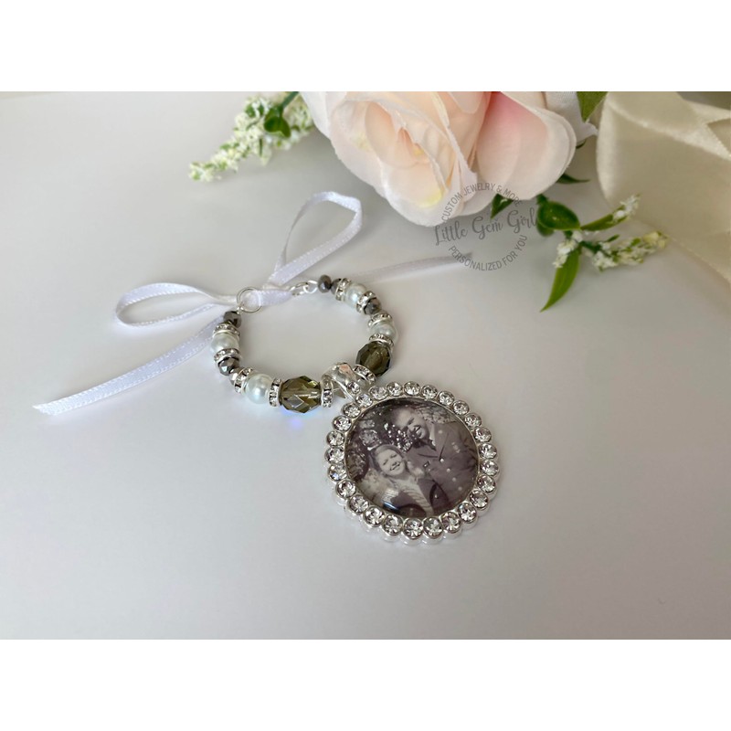- Simply upload your photos and we'll create it for you! Our exclusive Bougie Beaded Bridal Bouquet Charm is the perfect way to personalize a wedding gift for the bride. Made with a photo of your loved one in a sparkly silver rhinestone pendant, it also includes white pearl beads, rhinestones, and premium ab crystals which adds a hint of something blue to the bouquet. The included white ribbon makes it easy to secure and adds a special touch to the bouquet.