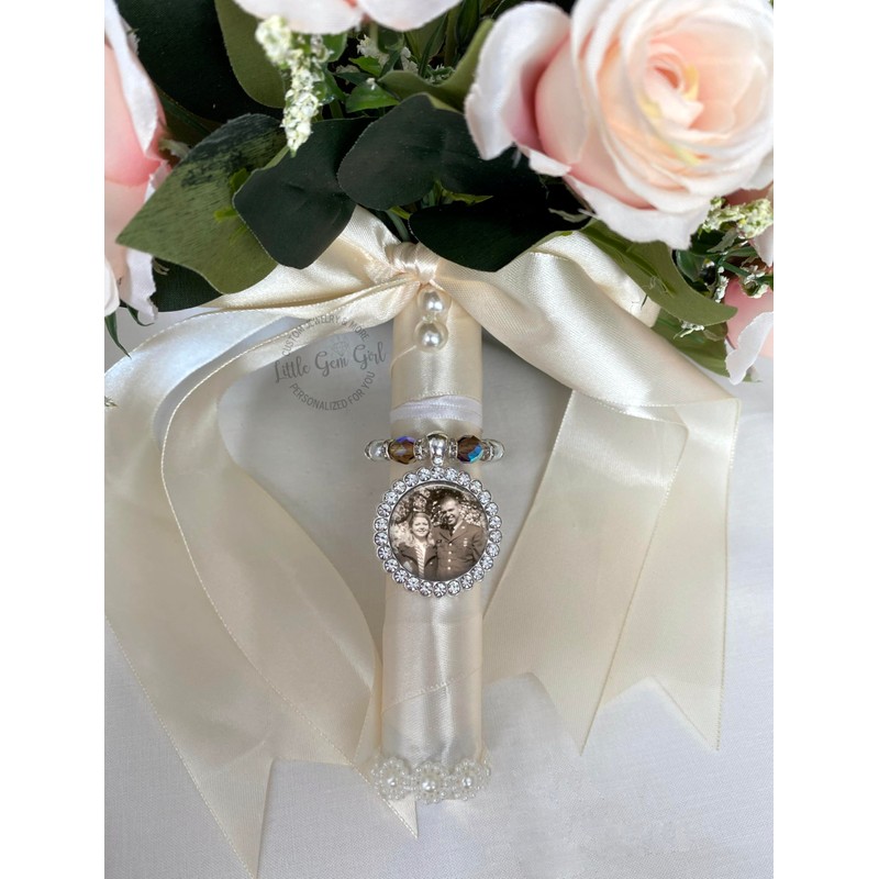 - Custom Photo Wedding Bouquet Charms are the perfect way to personalize your bouquet and carry a special photo of your beloved ones. A heartfelt gesture for the bride-to-be, this memorial piece can serve as a token of remembrance if her father cannot walk her down the aisle. A touching wedding gift to honor the special relationship between a daughter and her dad.