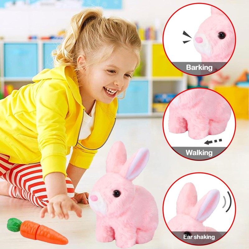 - Bouncing and wobbling: this is a vibrant rabbit that is characterised by bouncing, wobbly and twitching nose. This interactive rabbit jumps forward and makes a sound while the ears of the toy begin to shake and the mouth of the toy chews like a real animal, cute enough to attract children's attention. It is a good rabbit toy to make your child happy after opening the switch.