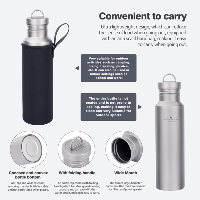 - High quality - This water bottle is made of TA1 pure titanium, which is durable and never rusts. It does not react with beverages and can maintain the original flavor of tea or coffee.