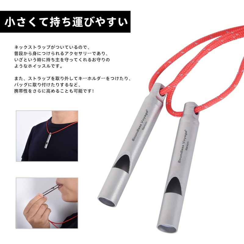 - (Product Details) Material: Titanium; Size (Approx.): Diameter 0.3 inches (8 mm) x Length 2.1 inches (54 mm); Weight (Approx.): 0.2 oz (5 g); Set Includes: 2 whistles + neck strap included