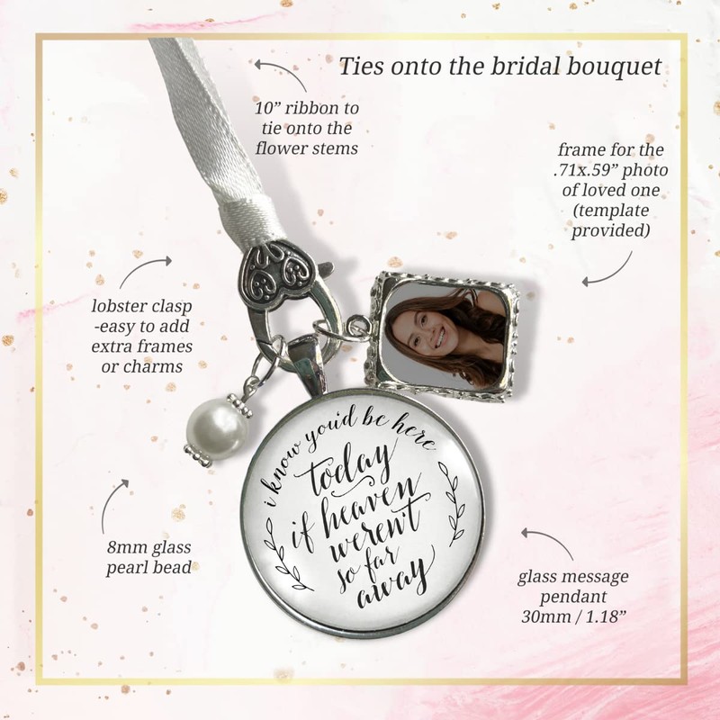 Bouquet Photo Charm For Wedding Memory I Know You'd Be Here Today If Heaven Honor Any Loved One Silvertone Jewelry White Glass Pendant White Bead 1 Picture Frame Bridal Floral DIY Template