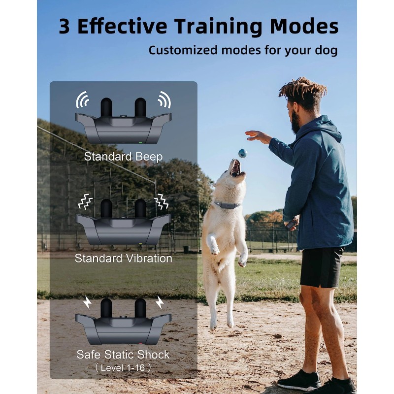 【3-IN-1 Safe, Humane Training Modes】 Our electric dog shock collar offers three safe and effective training modes: beep (standard), vibration (standard), and adjustable levels of safe static shock (1-16). These modes can be tailored to your dog's temperament, making training a breeze and promoting good behavior.