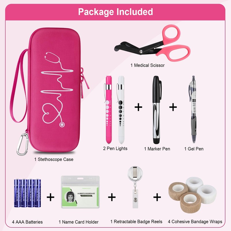 - Nurse Tool Kits: Comes with a stethoscope case kit, contains 1 pc stethoscope case, 1 pc medical scissors, 4 pcs self adhesive bandage wraps, 2 pcs medical pen lights with 4 AAA batteries, 1 pc marker pen, 1 pc gel pen, 1 pc ID card holder with reel clip. 15pcs nursing kit, easy to use for daily work.