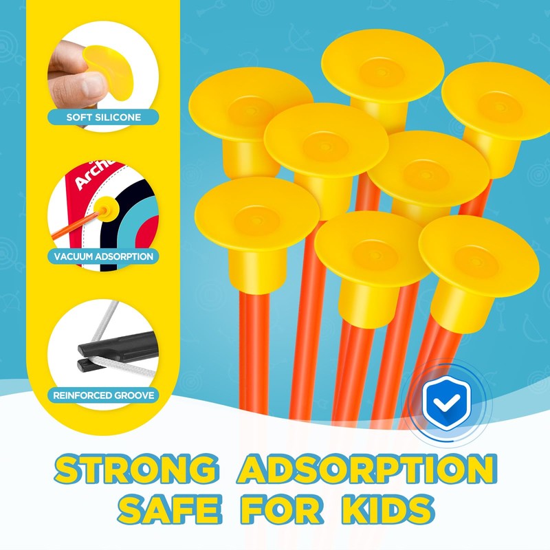 - POWERFUL SUCTION & LED LIGHTS🌈 – Say goodbye to lost arrows! Our improved 20 large suction cup arrows stick to smooth glass, windows, fridges, and targets. The adjustable bowstring ensures precision, and the built-in LED lights (2xAAA batteries required) add some flashy fun for nighttime play. Whether hanging on the wall or standing on the ground, our target is ready for action. Light and portable, it's perfect for indoor and outdoor play. Watch as your backyard transforms into Sherwood Forest!