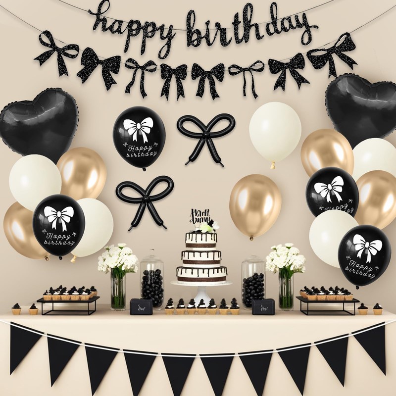 - BOW BIRTHDAY PARTY DECORATIONS: You will get 1pc black happy birthday banner,1pc black bow garland,12in black bow print latex balloons 10pc,12in sand white balloons 10pc,12in metallic champagne gold 6pc,18in cream heart foil balloons 2pc,10pc black white long balloons ribbon and 1pc ribbon(you can diy it as bow decor),1pc glue point.