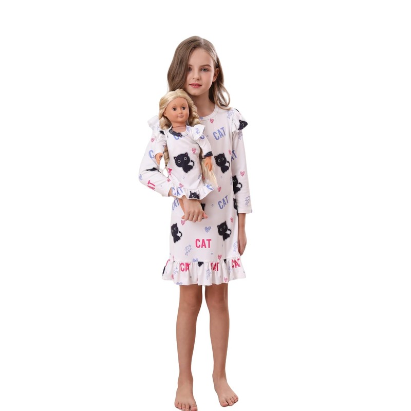 Bow Dream Girl Dress Cute Cartoon and Matching American Girl Doll Clothes Accessories for Girls Dresses White Cat Size 120