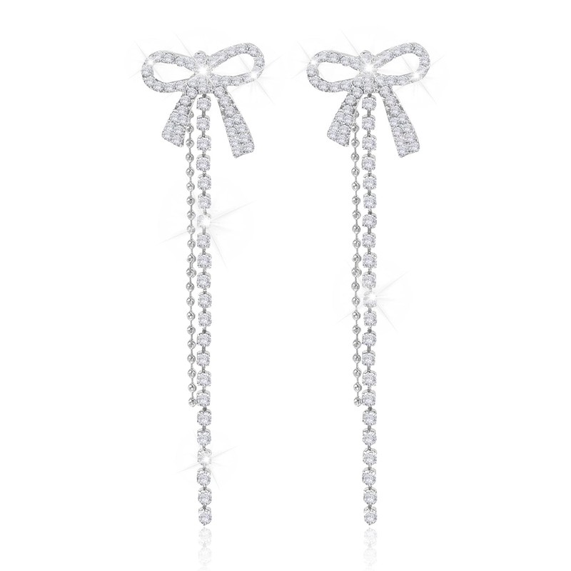 Bow Earings for Women Long Tassel Earring Sparkly Rhinestone Crystal Dangle Drop Earrings for Wedding Prom Party Jewelry Gifts for Women-S