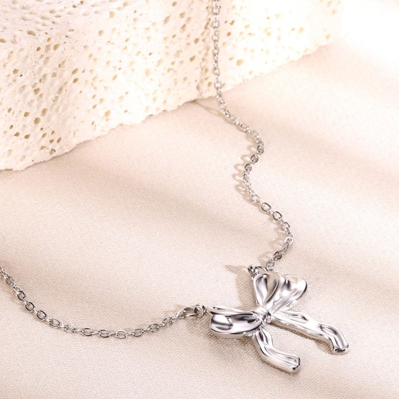 - Trendy Bowknot Pendant Necklace: Make a statement with the Trendy Rhinestone Bowknot Pendant Necklace that combines classic charm with a modern edge. The beautiful rhinestone-encrusted bowknot pendant catches the light with every movement, while the gold or silver finish gives it a luxurious, timeless appeal.