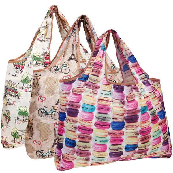 Bowbear Foldable Nylon Reusable Shopping Grocery Bag (Set of 3), Macarons & French