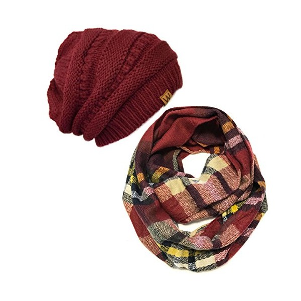 Bowbear Tartan Winter Infinity Scarf with Beanie, Multicolored + Wine Red