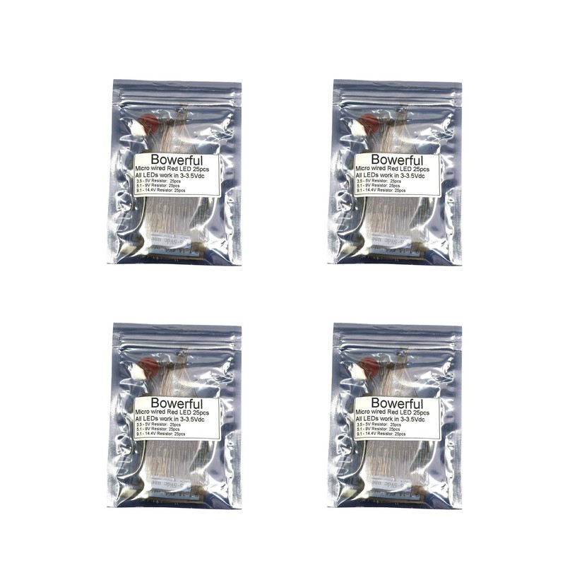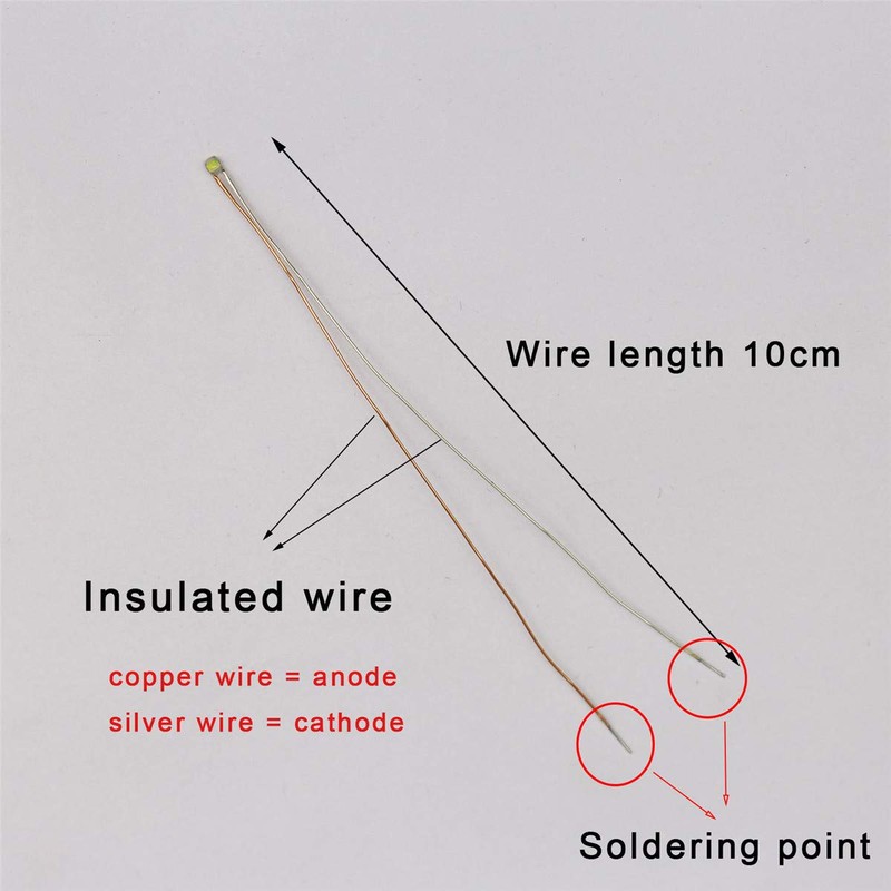 This pre-wired LED is Super small with resin cover to protect, with 10cm wired,Super strong LEDs and wire,The wire is bendable, it easy to fix any shape as you likeYou can connect with any 3V battery directlyAll LEDs work in 3-3.3 VdcDo not need add any resistor, it can work with normal 3V batteryIf you want the LEDs work in other voltage,we provide below resistors in the package too100 resistors (not pre-soldered) for 3.5~5V are included .100 resistors (not pre-soldered) for 5~9V are included .100 resistors (not pre-soldered) for 9~14V are included .Specifications :The LEDs size is : (length)06" X '03"(width) X 03"(height)-Luminance intensity: 300 mcd / 120?? Viewing Angle-Emitting color: Red-Forward voltage:3-3.3VDC Compatible.(if you need the LEDs work in other voltage, please add resistor)-Forward current Typical: 15mA or below; Max: 20mA-Viewing angle:120?? Viewing AngleApplications & Installations:Suitable used in any small model, cosplay, small model building, Very low power consumption, and high luminous intensityRecommended voltage is 12VPackage included :100pcs pre-wired SMD LEDs (pre-soldered) with 10cm wire length100 resistors (not pre-soldered) for 3.5~5V are included .100 resistors (not pre-soldered) for 5~9V are included .100 resistors (not pre-soldered) for 9~14V are included .Search "bowerful led" for more related leds