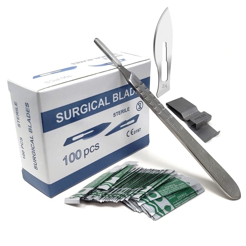 Box of 100 Scalpel Sterile Blades Carbon Steel Individually Foil Wrapped With Stainless Steel Scalpel Handle & Blade Remover (Blade #24 + Scalpel Handle + Blade Remover)