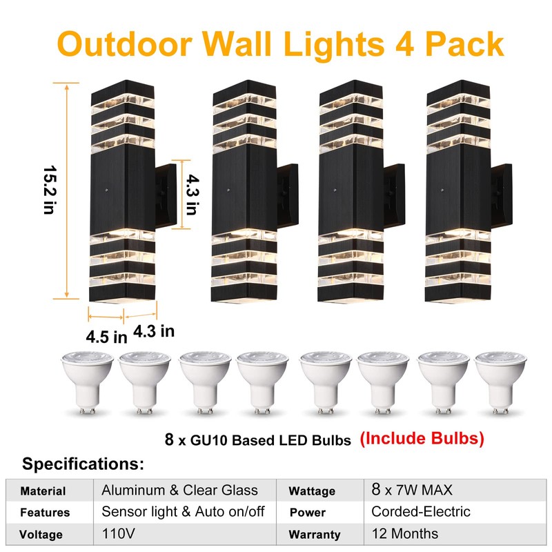 A: Each front door lights outdoor contains 2*7W GU10 bulbs. If you want to replace the bulb, you only need to open the transparent glass cover, screw the bulb into the GU10 socket (maximum 60 watts each), and then screw the cover back. Be sure to cut off the power to ensure safety!
