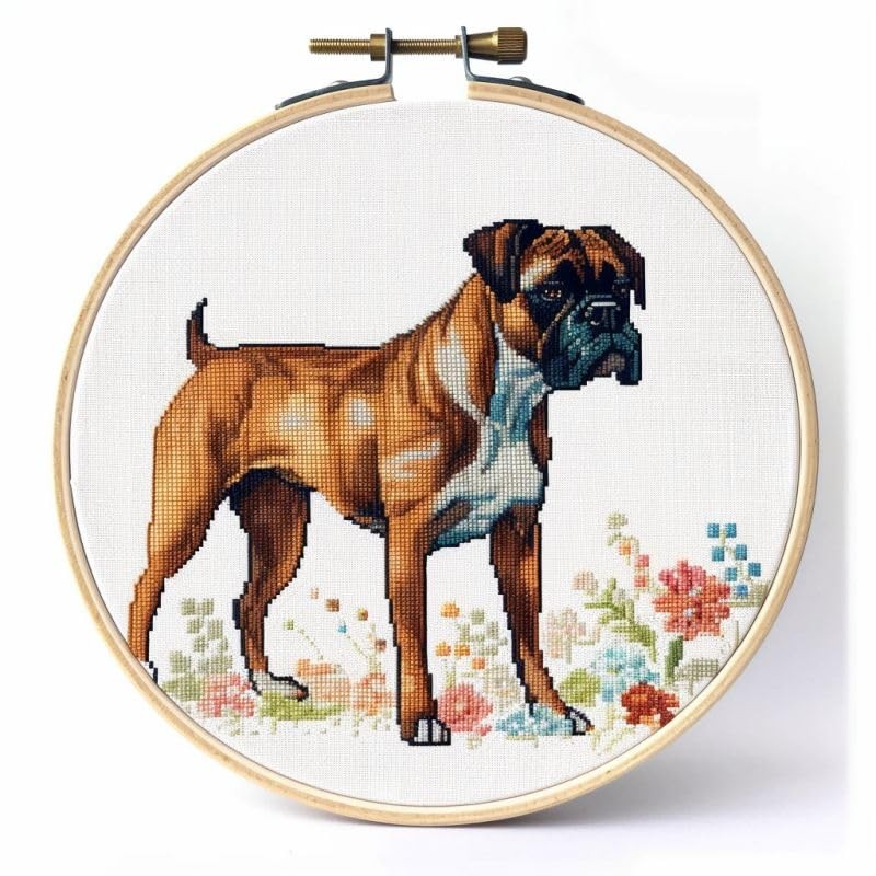Boxer Dog Cross Stitch Kits with Hoop Easy Pattern Stamped Cross-Stitch Supplies Needlework DIY 11CT 3 Strands Cotton Thread Printed DIY Needlepoint Kits 35×35cm (ag63)