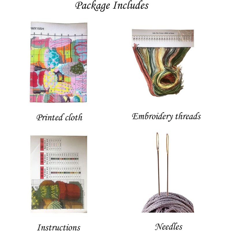 - 【package includes】printed canvas x1,Cotton thread x 1set (30% more than necessary),Needle x2 ,plastic embroidery hoop x 1,paper blueprint x1set ,English paper instructionsx1