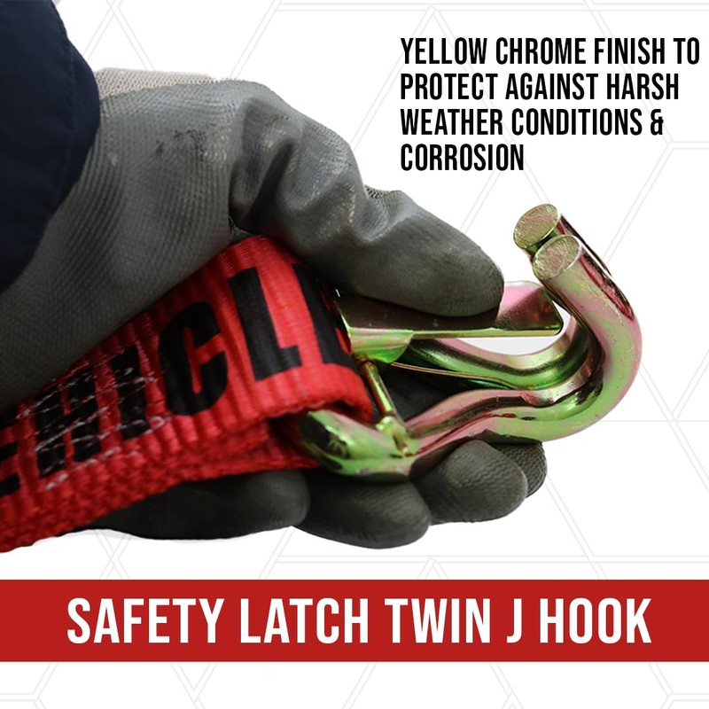 - [DOUBLE J HOOK SAFETY LATCH] – The Twin J hook is designed to wrap around a car’s axle, control arm, or structural part of a vehicle to pull. With a protective sleeve around the straps, this will protect the vehicle and the straps from any scratches or damage. The J hook itself has an integrated safety latch to ensure the hook is always latched in.