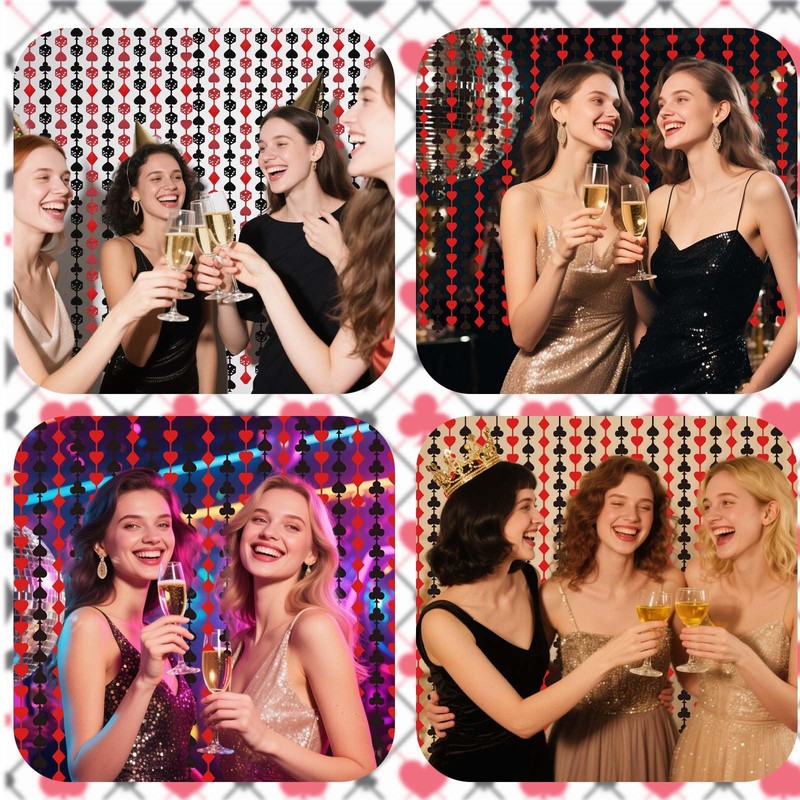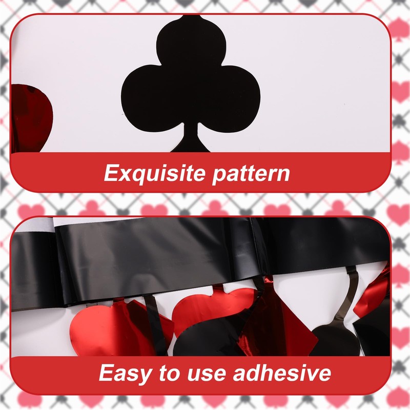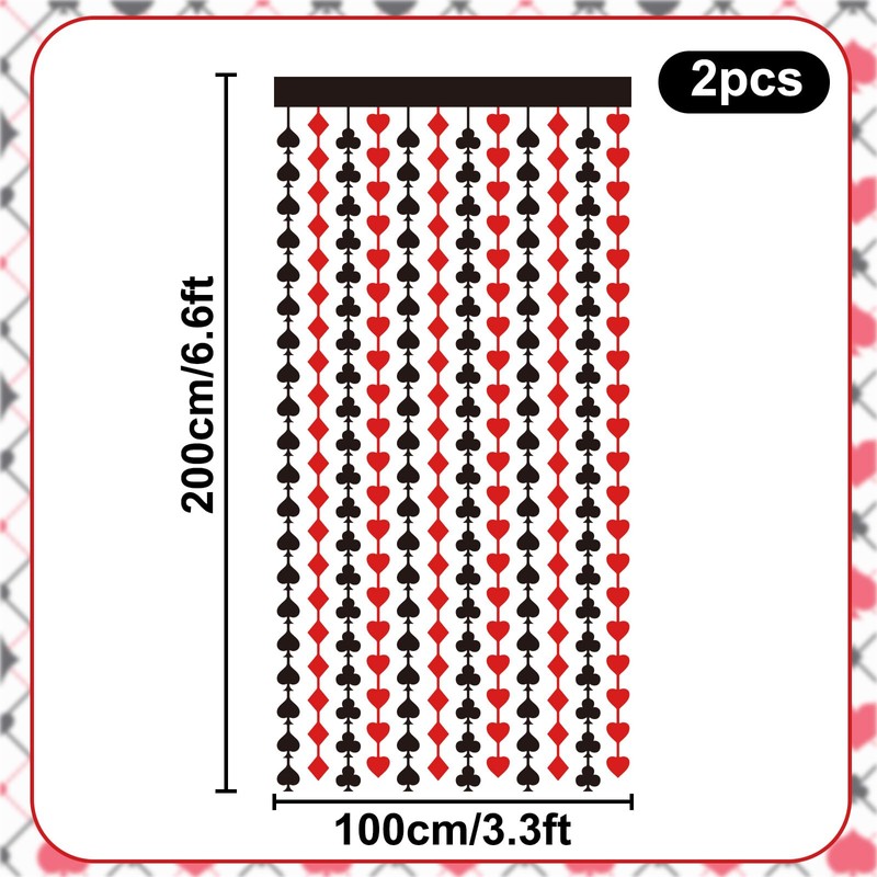 - Casino Theme Design: This aluminum foil curtain features a casino themed style and a striking red and black poker design, adding atmosphere to casino nights, poker parties, and game night decorations.