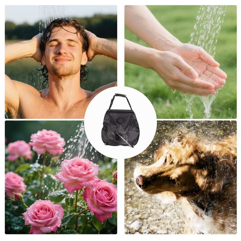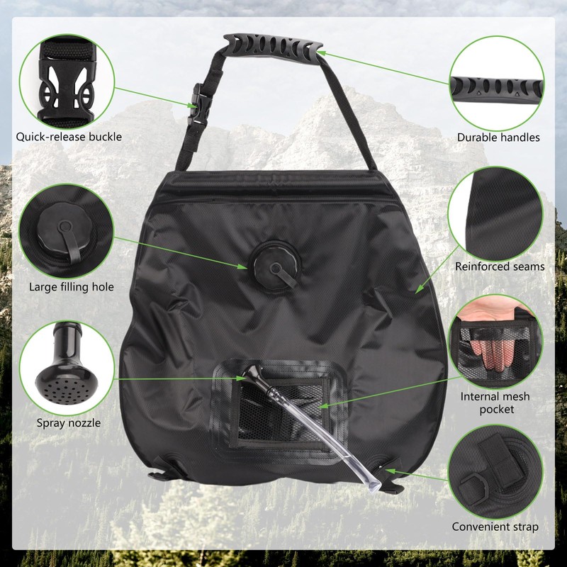 • Large Capacity: This solar powered shower bag can can hold 5 gallons/20 L water, which is enough for about 2-3 showers. The wide mouth design makes it easy to fill the water, which is very convenient.