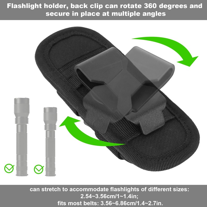 - Rotatable Clip This flashlight pouch uses a strong back clip, which can rotate freely 360 degrees, allowing you to adjust the light angle of the flashlight as you like. It also stretches to accommodate flashlight tube diameters from 1" to 1.4" and strap widths from 1.4" to 2.7".