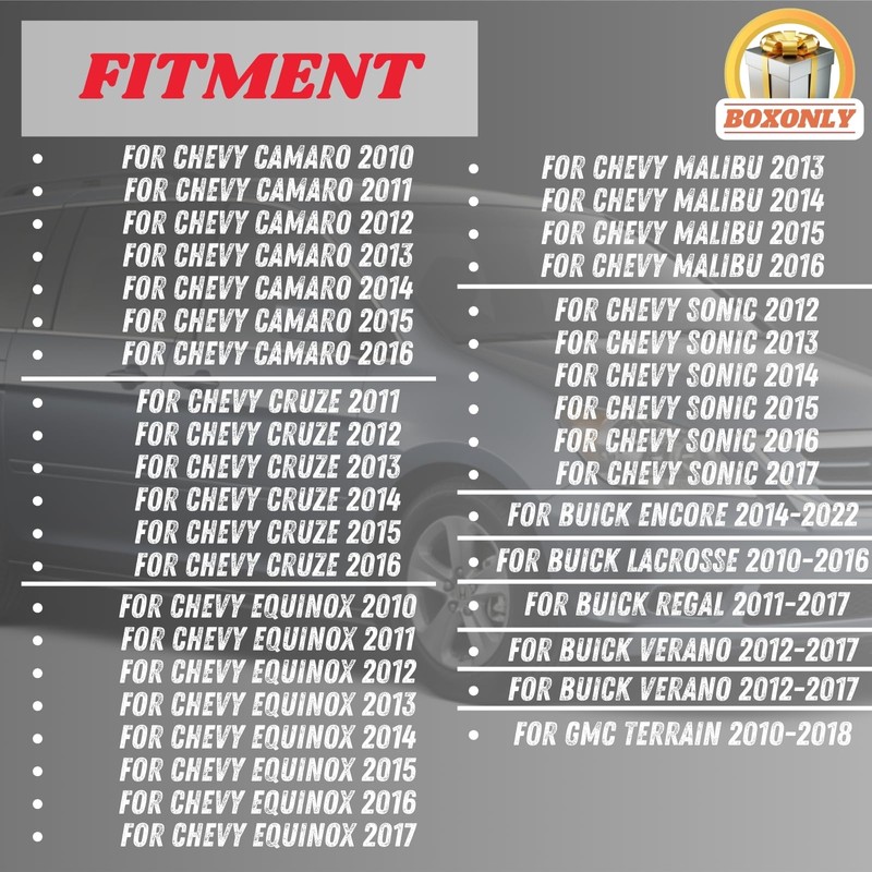 - ✅ Perfect Fit for Chevy & More – Designed for Chevy Cruze (2011-2016), Chevy Malibu (2013-2016), Chevy Camaro (2010-2016), Chevy Equinox (2010-2017), Chevy Sonic (2012-2018), Buick Encore (2014-2022), Buick LaCrosse (2010-2016), Buick Regal (2011-2017), Buick Verano (2012-2017), GMC Terrain (2010-2018). Always verify fitment before purchasing.