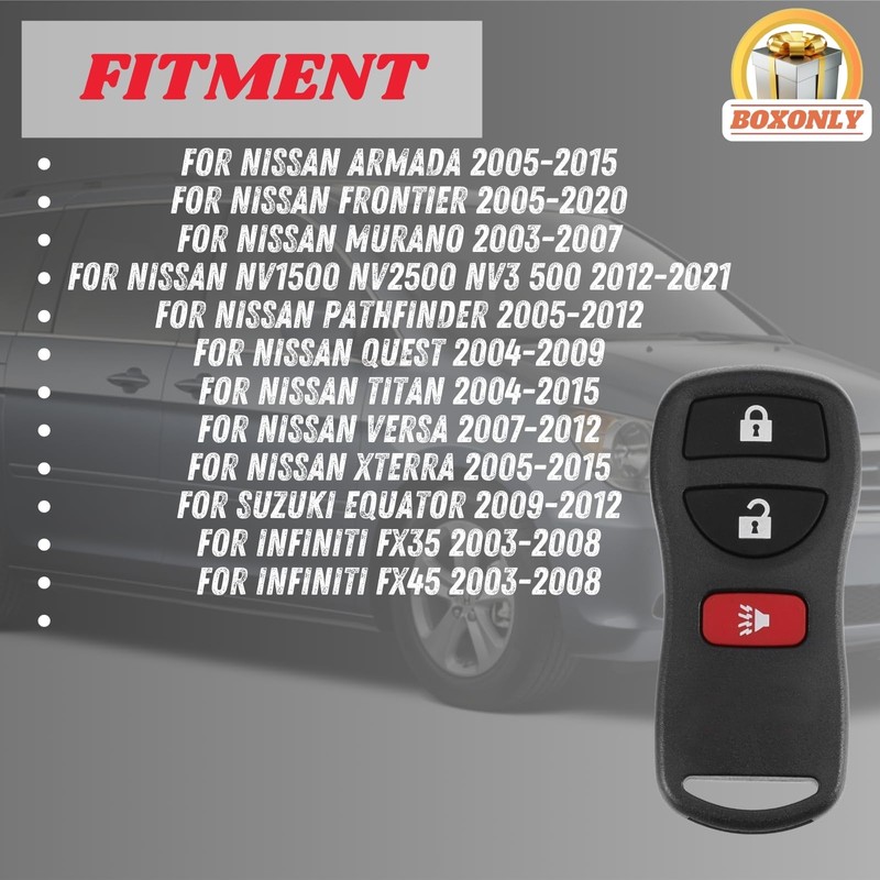 Losing your key fob, replacement key fob, key fob for Nissan accessories, Pathfinder accessories, Frontier accessories can be frustrating, but replacing it should not be. The Boxonly KBRASTU15 Keyless Entry Remote is designed for Nissan, Infiniti, and Suzuki vehicles, offering a cost-effective, high-performance alternative to dealership replacements. Key Features and Benefits FCC ID Compatibility: KBRASTU15, CWTWB1U415, CWTWB1U733, CWTWB1U821. OE Number Support: Replaces multiple OEM part numbers for maximum compatibility. 3-Button Functionality: Lock, Unlock, Panic Alarm. 315 MHz Frequency: Ensures strong signal response and quick vehicle recognition. Pre-Installed Lithium 3V Battery: Ready to use with long battery life. Durable Build: Made from high-quality ABS plastic with scratch-resistant buttons. Programming Instructions and Setup Locksmith Cutting Required: The key must be professionally cut and programmed at a dealership or locksmith. DIY Programming Option: If a working key is available, follow our clear step-by-step programming guide to pair it with your vehicle. What’s Included? 1 × Keyless Entry Remote (Battery Included) 1 × Uncut Key Blade Vehicle Compatibility List (By Year and Model) For Nissan: Pathfinder (2005 2006 2007 2008 2009 2010 2011 2012) NV1500, NV2500, NV3500 (2012 2013 2014 2015 2016 2017 2018 2019 2020 2021) Frontier (2005 2006 2007 2008 2009 2010 2011 2012 2013 2014 2015 2016 2017 2018 2019 2020) Armada (2005 2006 2007 2008 2009 2010 2011 2012 2013 2014 2015) Murano (2003 2004 2005 2006 2007) Quest (2004 2005 2006 2007 2008 2009) Xterra (2005 2006 2007 2008 2009 2010 2011 2012 2013 2014 2015) Versa (2007 2008 2009 2010 2011 2012) Titan (2004 2005 2006 2007 2008 2009 2010 2011 2012 2013 2014 2015) For Infiniti: FX35 (2003 2004 2005 2006 2007 2008) FX45 (2003 2004 2005 2006 2007 2008) For Suzuki: Equator (2009 2010 2011 2012) Before purchase, confirm your FCC ID, OE number, and part number to ensure compatibility with your vehicle.