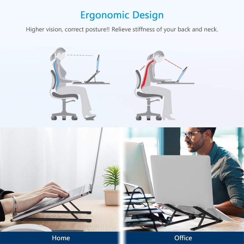 • 【Adjustable in 6-levels】The portable laptop stand provides 6 levels of height adjustment, you can adjust the height according to your needs. The ergonomic design will give you comfortable watching and typing, which also helps reduce stiff back and neck.