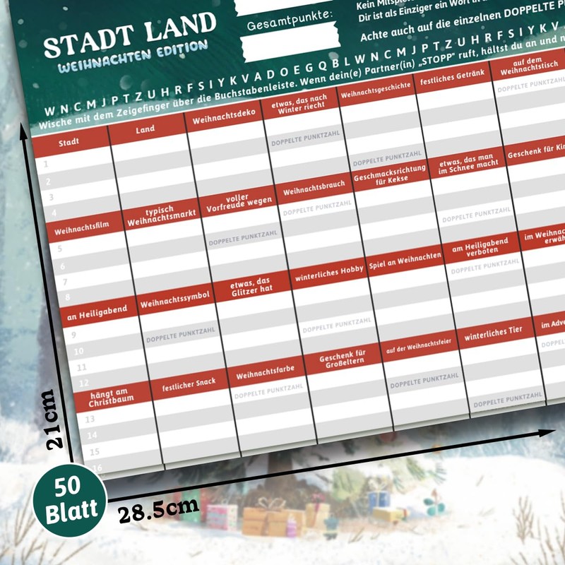 - 【Spiel für die Ganze Familie】Erleben Sie die Stadt Land Fluss Weihnachten Edition – ein lustiges Spiel für die ganze Familie und Freunde. Perfekt für Weihnachtsfeiern, Familiengeschenke Weihnachten oder als Adventskalender Füllung. Spaß und Spannung für Kinder, Erwachsene und alle, die Weihnachtsspiele lieben