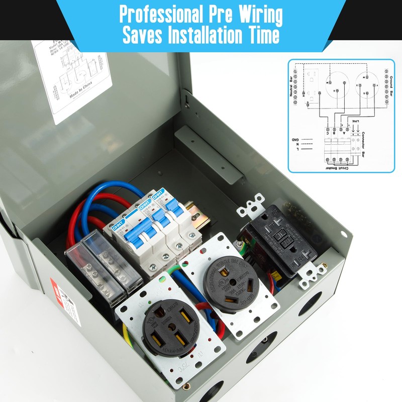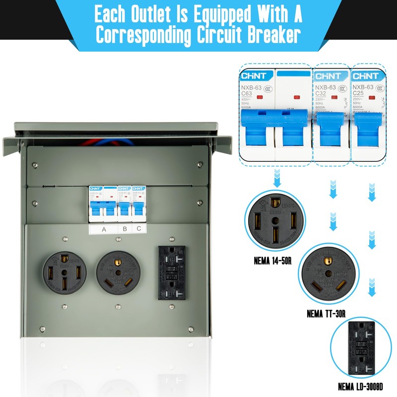 - 【GUARANTEE OF SAFETY PERFORMANCE】Our RV electrical panel features UL-listed 50 Amp, 30 Amp and 20 Amp outlets for guaranteed safety and reliability. Each outlet is protected by its own dedicated circuit breaker, adding an extra layer of protection against overloads and electrical hazards