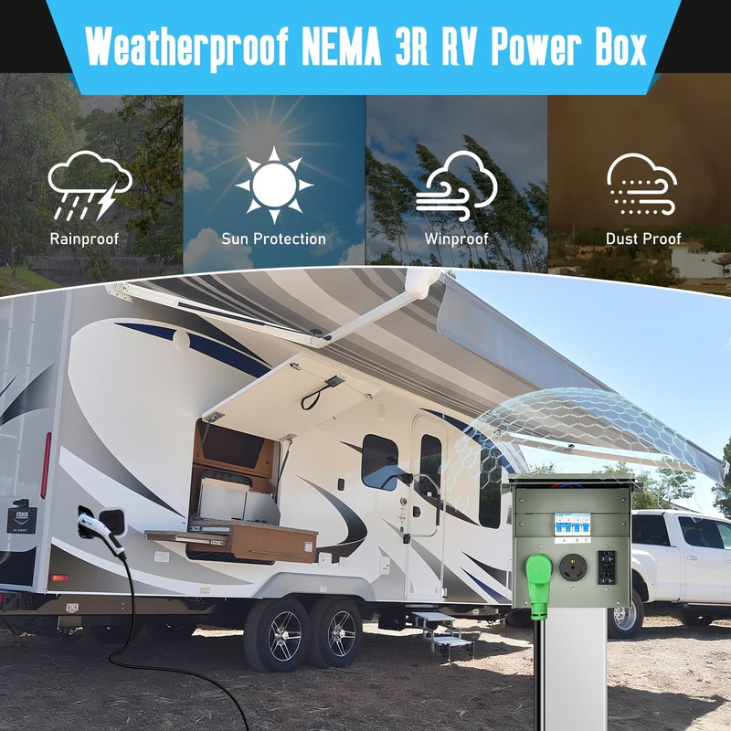- 【HEAVY-DUTY & WEATHERPROOF CONSTRUCTION】Designed to meet NEMA 3R standards, this 50/30/20 amp RV outlet box is built with a waterproof, fire-resistant, and UV-resistant housing for long-lasting durability. It withstands rain, dust, and extreme temperatures, making it ideal for outdoor use in any climate