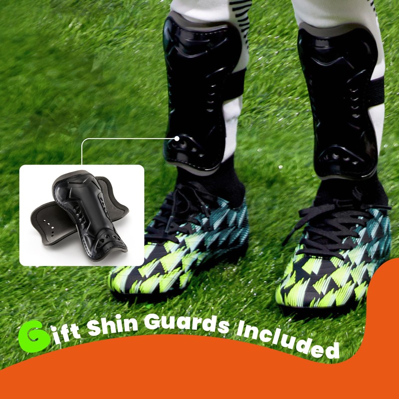 - đĄăShin Guards for ProtectionăEach pair of Kids Soccer Shoes comes with specially designed shin guards to protect young players. Providing reliable defense against bumps and impacts, these cleats give kids the confidence to play hard and parents peace of mind.