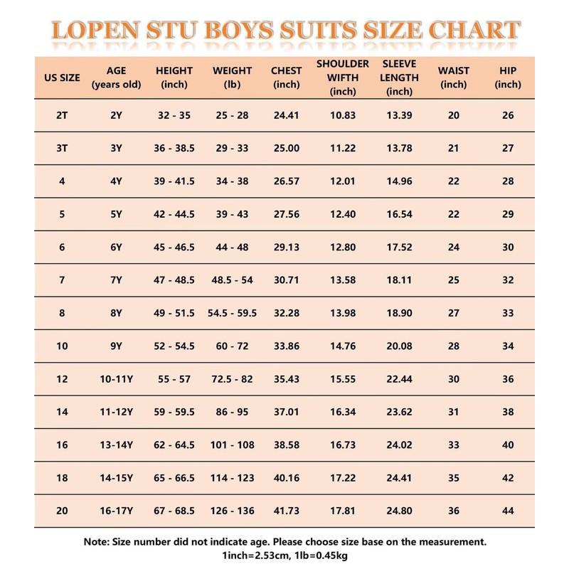 - Boys Suit Size Choosing Tips - The number after size doesn't indicate age. There are height and weight for reference in picture, please check our size chart and choose boys suits size base on measurement not age. We have toddler boys suit size 2 3 4, little boy's suit size 5 6 7 8 10, big boys suits size 12 14 16 18 20.