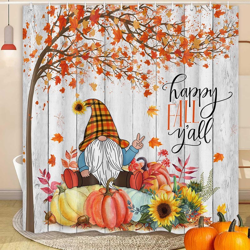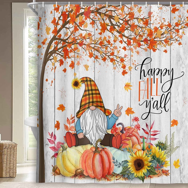 Boziqr Fall Gnome Thanksgiving Shower Curtain, Autumn Maple Tree Leaves Pumpkin Bathroom Curtains, Farmhouse Harvest Rustic Decor with Hooks Set 70 x 70 Inch