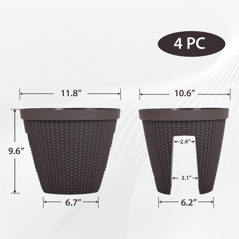 BPS 12'' Balcony Rattan Pattern Railing Planter Box with Drainage Holes and Adjustable Brackets for Outdoor Garden Patio,Deck,Fence Set of 4 - Brown