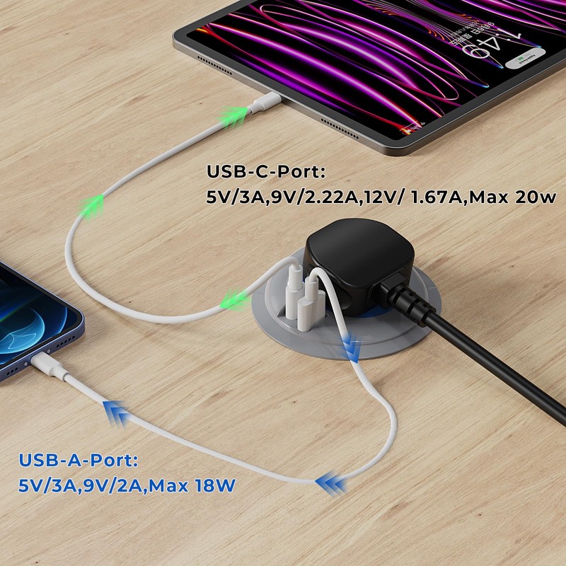 - 【Multi Outlets】This power grommet is with 1 UK power sockets, 1 USB Aand 1 USB C fast charging ports and 2M power cord.