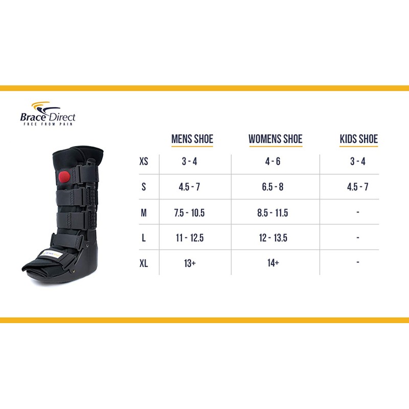 Brace Direct brings you the best in class air fracture boot from Brace Align at direct pricing. While wearing the Cam Walker Fracture Medical Boot you will reduce pain, swelling and edema of the injured foot and speeding up the recovery process. The walking boot is made out of a polymer material making it extremely durable for long periods of wear with your comfort in mind. The medical grade velcro straps make it easy to put on and take off when bathing and sleeping and keeping you secure, stable and protected while adjusting for swelling or bandages. With the light weight, low-profile rocker design you will walk more naturally and continue with your regular day's activies without feeling encumbered by a heavy walking brace or cast. The interior ultra soft cushioned material is designed for breathability and keeps you feeling cool and dry. The open toe area allows maximum airflow while also ensuring a comfortable fit for adjusting and removing bandages or socks. Controlled ankle movement support during everyday wear. Our walker boot provides ankle support after acute ankle sprains or fractures. The air cast boot has is PDAC approved as L4360 and L4361.