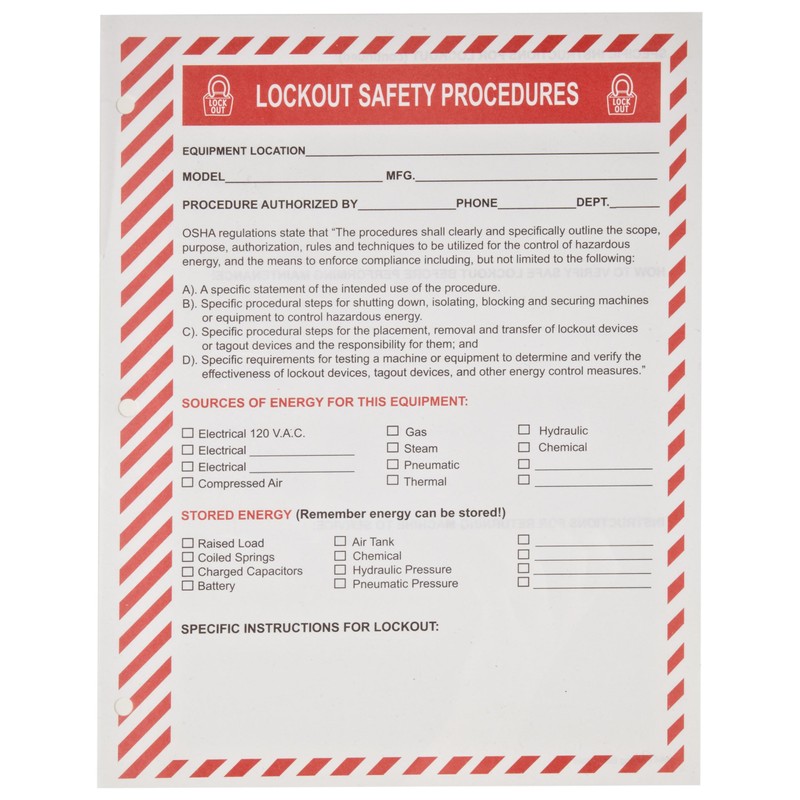 - Predrilled forms provide an organized system for quickly and easily recording the necessary hazard information and lockout steps
