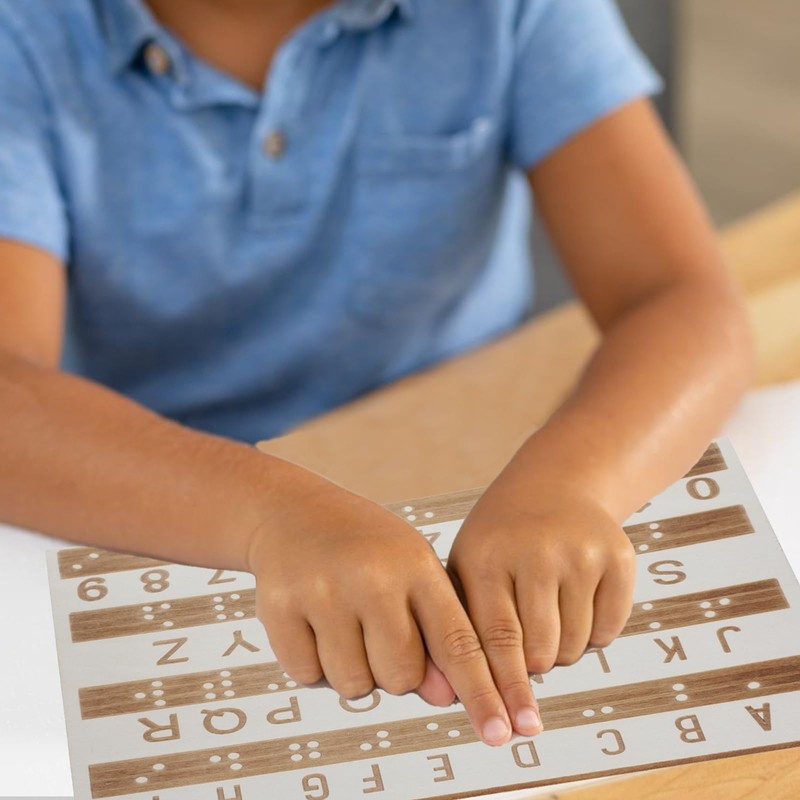 2. Featuring raised dots and engraved letters, this Braille fingerboard provides a tactile learning experience for the visually impaired. The clear engraving also aids sighted individuals in understanding Braille