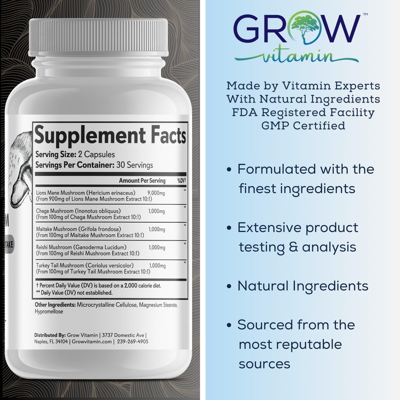 - COMPREHENSIVE MUSHROOM BLEND: Our mushroom capsules go beyond just Lion's Mane. Each serving includes 100mg each of Chaga, Maitake, Reishi, and Turkey Tail mushrooms, all standardized to a potent 10:1 extract ratio, equivalent to 1000mg of each mushroom.