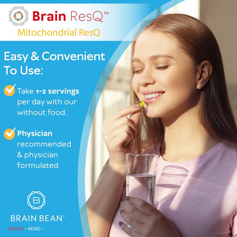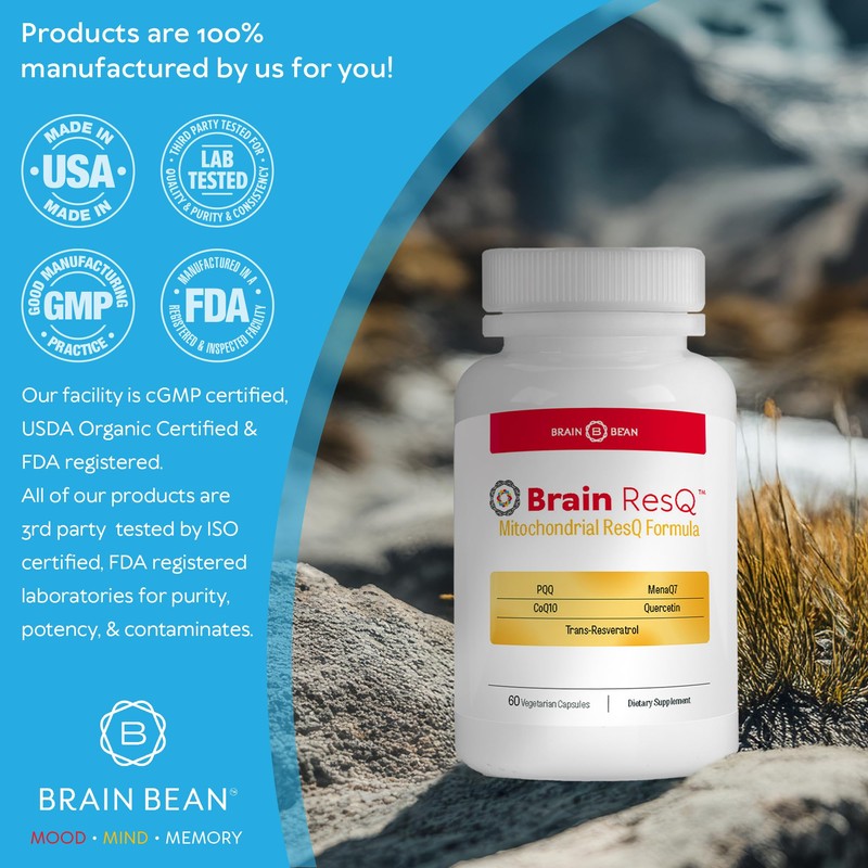 Brain ResQ Advanced Mitochondrial Formula with PQQ, CoQ10, Trans Resveratrol, MenaQ7 & Quercetin Supplement - 100mg of CoQ10 & 15mg PQQ โ Supports Brain, Heart & Cellular Health โ 60 Capsules