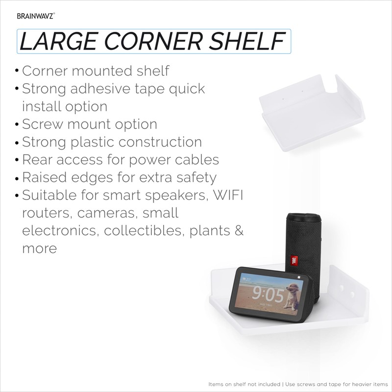 BRAINWAVZ 9" Small Corner Shelf Mount, Adhesive & Screw in, for Speakers, Cameras, Baby Monitors, Plants, Books Electronics, Collectibles & More, Floating Shelves (White)