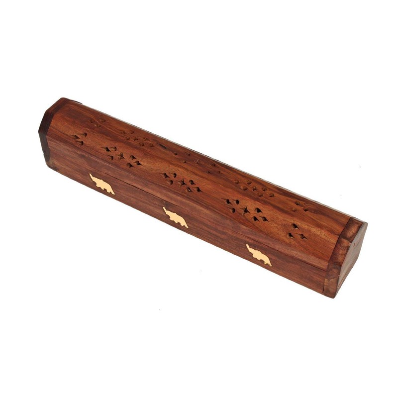 Bramble & Jones Leaf-Solid Wood Wooden Incense Joss Sticks Storage Box with Built in Ash Catcher and Cone Burner, Brown, 33.8 x 7.2 x 7.2 cm