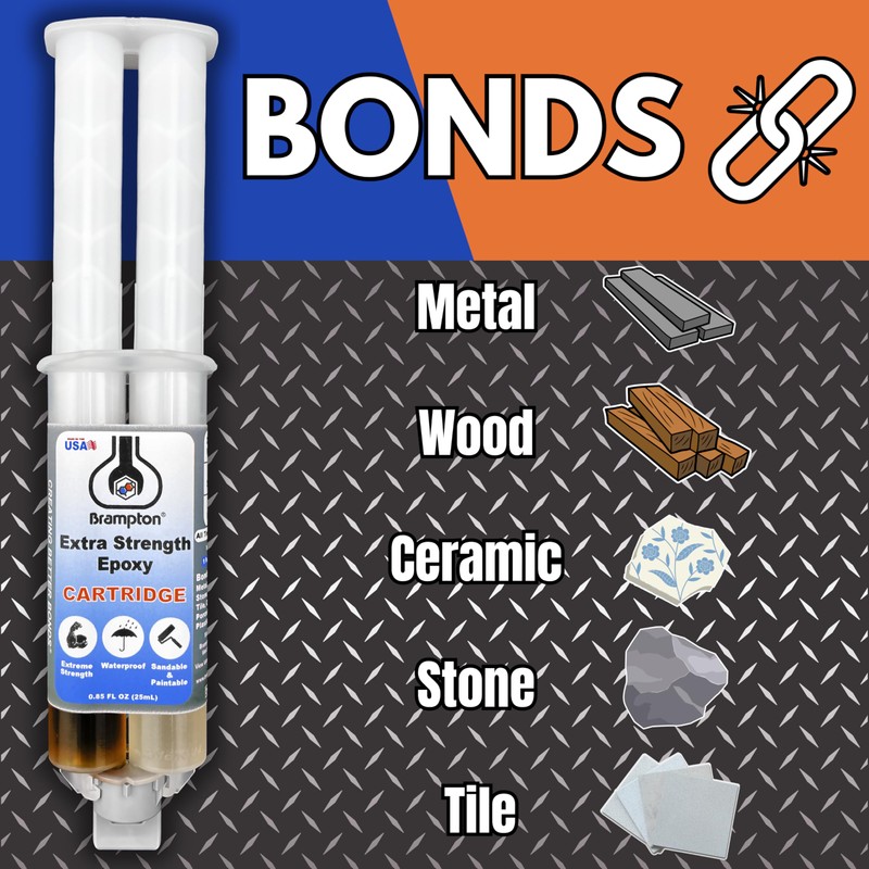 - Versatile: Brampton's extra strength epoxy resin bonds metal, glass, wood, concrete, tile, ceramic, porcelain, and most plastics, making it a versatile epoxy glue option.