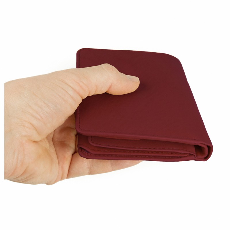 - Even larger documents, such as a folded bank statement, can be stored in the wallet. For this purpose, two larger pockets or a central zip pocket. To ensure that nothing is lost, the parts of the wallet are held together with the slots or ID compartments with a press stud closure. So your cards and documents are always neatly packed away and protected from fingers