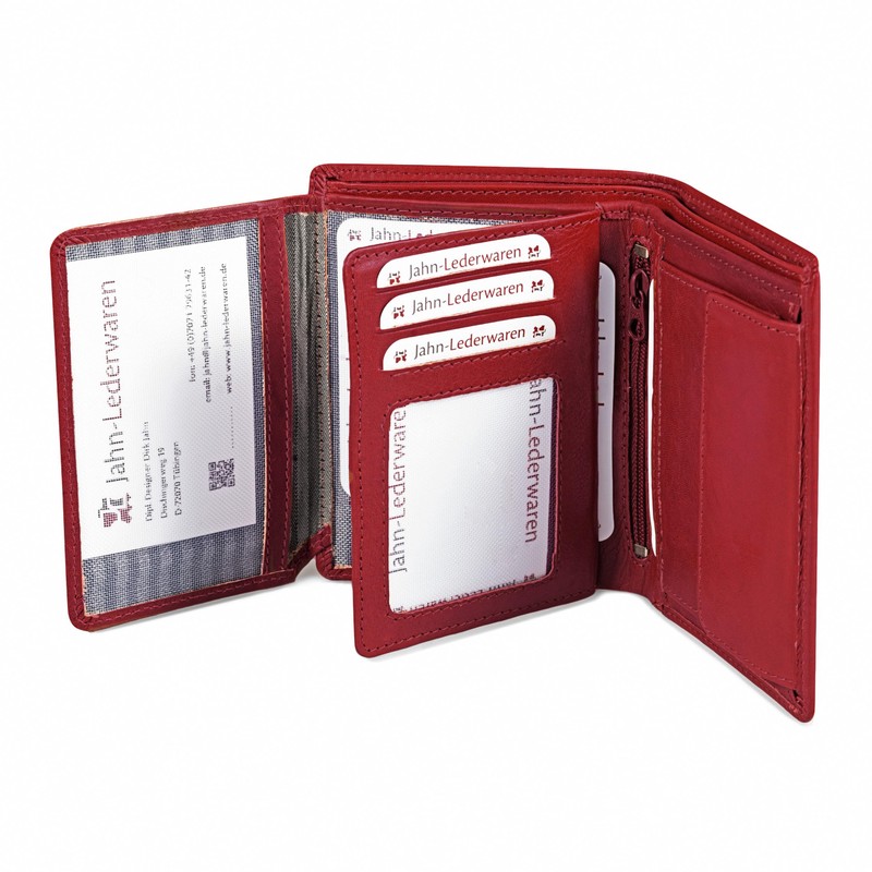 - The spacious wallet in portrait format has enough space for banknotes, coins and cards of all kinds. Even an old, large-format driving licence, an old ID card or the vehicle registration certificate can be easily stored in the practical wallet. There are extra three A7 ID slots, all with viewing window