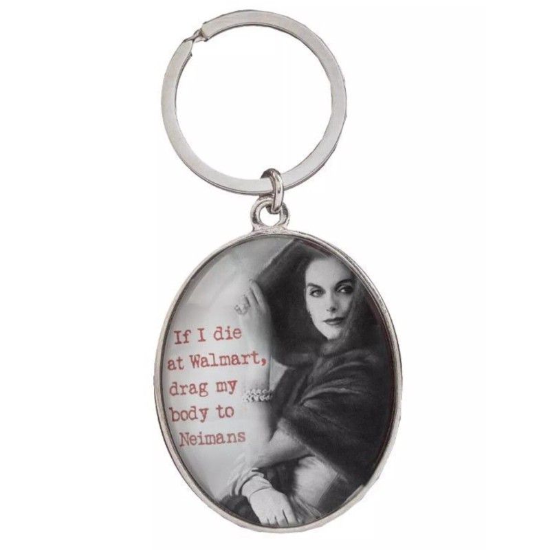 "If I die at Walmart, drag my body to Neimans." A diva and her droll dying request are rendered to a domed oval key chain which is sure to solicit smiles whilst keeping tabs on house keys.