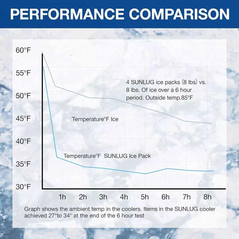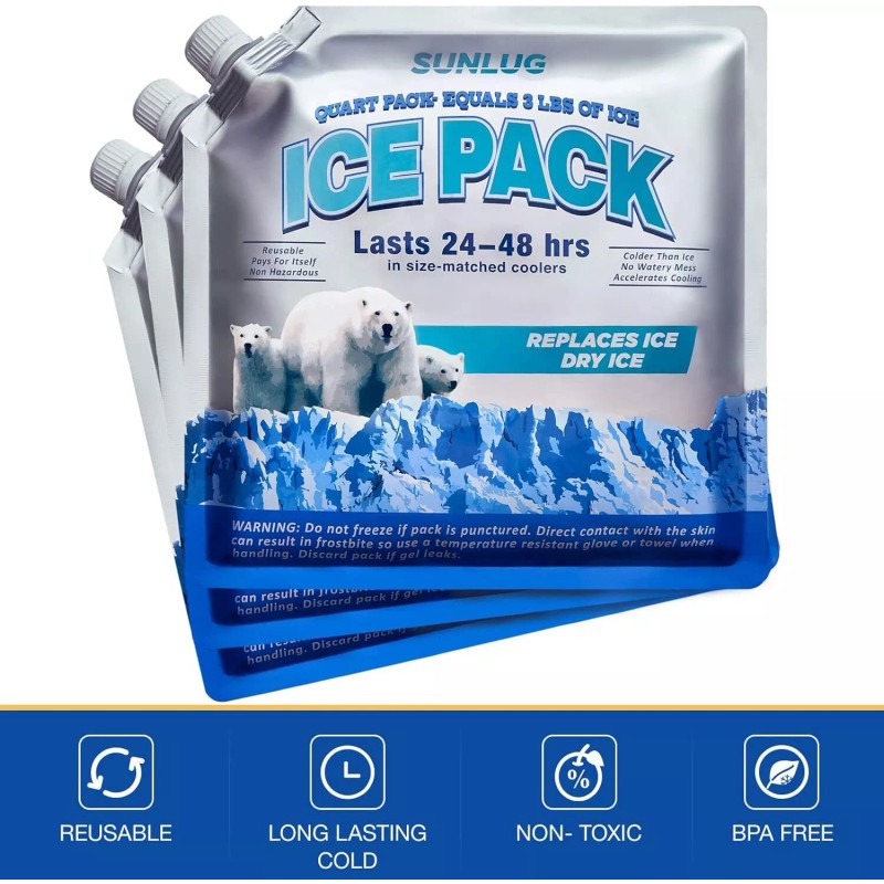 SUNLUG Cooler Ice Packs ——A substitute for traditional ice cubes & regular water and has a Colder & Faster & Longer cooling performance. Key Features & Specs Each ice pack size - 9.75 x 9.75 x 1 inches Included in a set - three corks & one funnel Each pack need fill in 28 ounces(3 1/2 cups of 8oz)of water Save more space for your coolers & Extended the food and drinks cooling time. Add Water Once & Reusable The inside of the ice pack is filled with a proprietary cooling gel mixture, just add water at home, shake and seal, and then turn it into a solid block after freezing, which creates a reusable ice pack. Superior Cooling Performance SUNLUG ice packs start out at freezer temperature and gradually heat up. Throughout the melting process, ice packs maintain the advantage of a lower melting point than traditional ice cubes. When the ice starts to melt and warm in your cooler, ice packs still remain cold, even as they begin to thaw. REUSABLE Just add water once and return the ice packs to the freezer after using and they'll be ready for your next outing. Save your money spending on ice cubes. LONG LASTING COLD Colder & Faster & Longer Ice Packs, the best ice alternative. Keep your food and drink chilled longer. NON-TOXIC Feel safe using cool coolers and sending them with your kids. Keep your food or drinks cold for a long time. BPA FREE SUNLUG Ice Packs made of high-quality BPA-Free materials. Designed to keep cool without harming the environment, and promote sustainability.